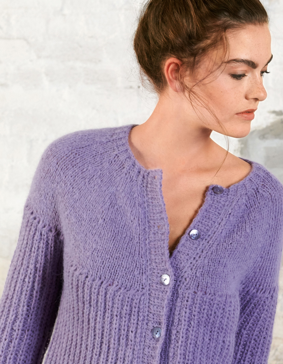 350 (400) г лиловой (цв. 26) пряжи Brigitte No. 2 (47% шерсти (ягненка) альпака, 45% хлопка, 8% овечьей (мериносовой) шерсти, 140 м/50 г) фирмы Lana Grossa; прямые спицы № 4 и № 6, круговые спицы № 6 длиной 80 и 120 см, круговые спицы № 4 длиной 80 см, крючок № 4; 7 лиловых перламутровых пуговиц диаметром 18 мм, подходящие по цвету швейные нитки.