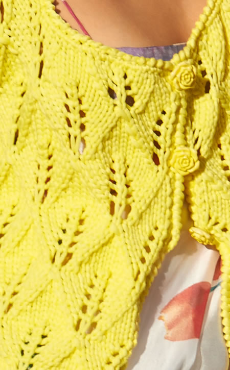 350 (400) г лимонно-желтой (цв. 23) пряжи Cashsilk (40% полиамида, 30% бамбука, 15% кашемира, 15% шелка, 75 м/50 г); прямые спицы № 7 и № 8; крючок № 6; 3 желтые пуговицы диаметром 25 мм.