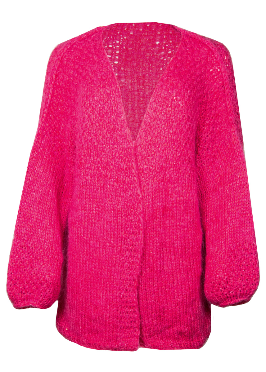 300 (350–400) г ярко- розовой (цв. 19) пряжи Brigitte No. 2 (47% шерсти (ягненка) альпака, 45% хлопка, 8% овечьей (мериносовой) шерсти, 140 м/50 г) и 175 (200–225) г ярко-розовой (цв. 28) пряжи Brigitte No. 3 (40% мохера (супер- кид), 37% шерсти, 23% полиамида, 100 м/25 г) фирмы Lana Grossa; круговые спицы № 10 длиной 40 и 80 см