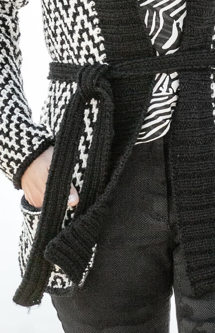 Этот кардиган с лацканами и поясом выполнен из легкой и теплой шерсти альпака. Особую элегантность ему придают удлиненный силуэт и четкий геометрический черно-белый узор. Беспроигрышный вариант.