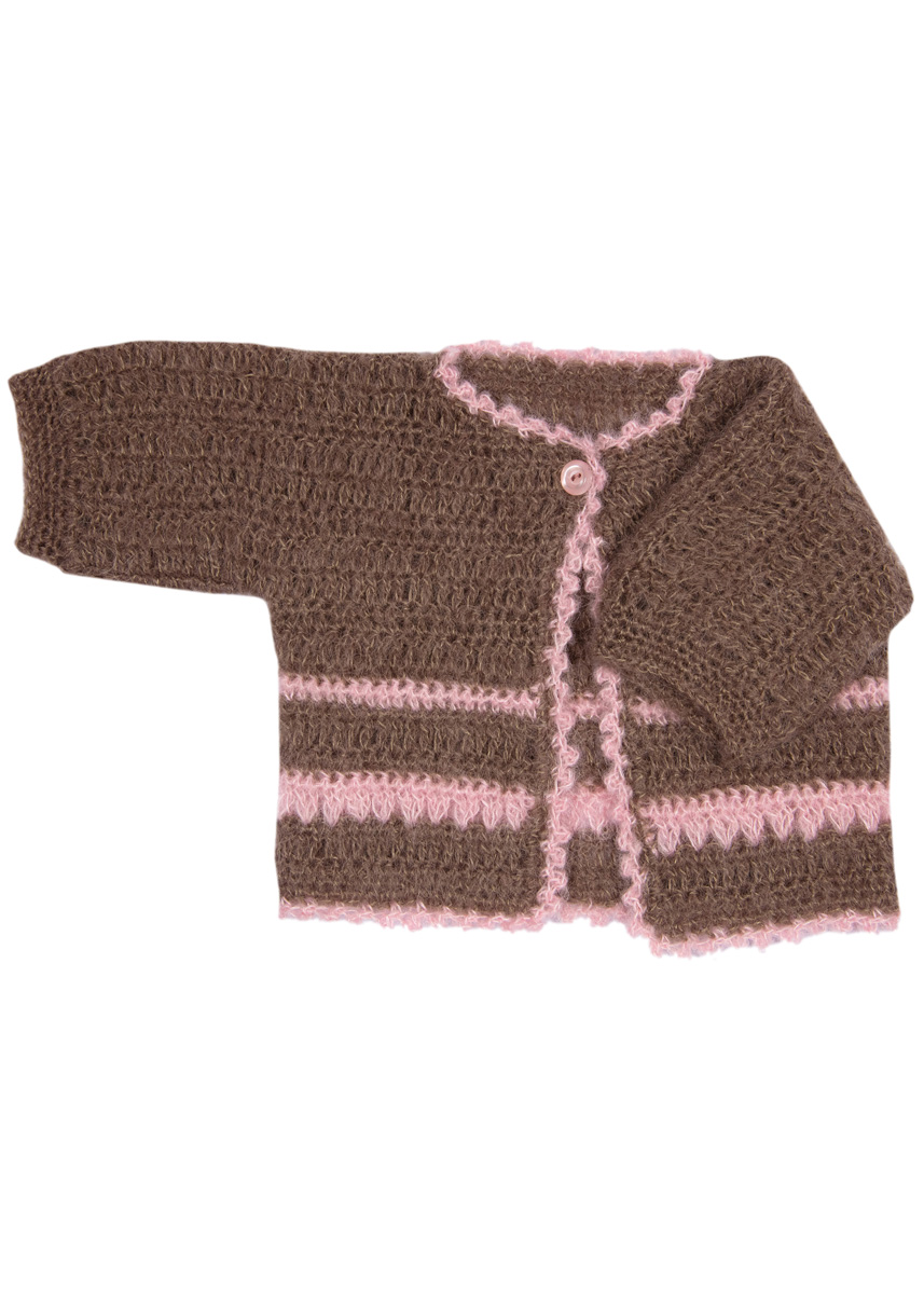 25 г цвета нуги (цв. 4) и 25 г розо- вой (цв. 8) пряжи Setasuri (69% шерсти сури альпака, 31% шелка, 212 м/25 г) фирмы Lana Grossa; крючок № 3; одна пуговица диаметром 12 мм