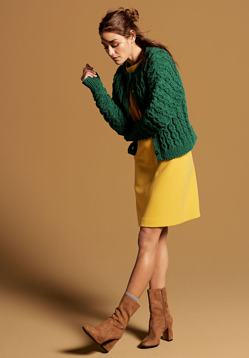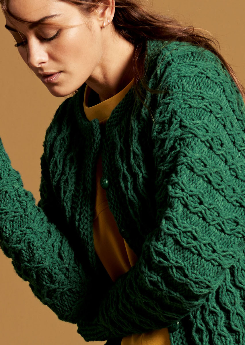 800 (900) г бутылочно-зеленой (цвет 57) пряжи Superbingo (100% шерсть, 55 м/50 г) фирмы Lana Grossa; прямые спицы № 6 и 7, 6 пуговиц зеленого цвета, диаметром 18 мм.
