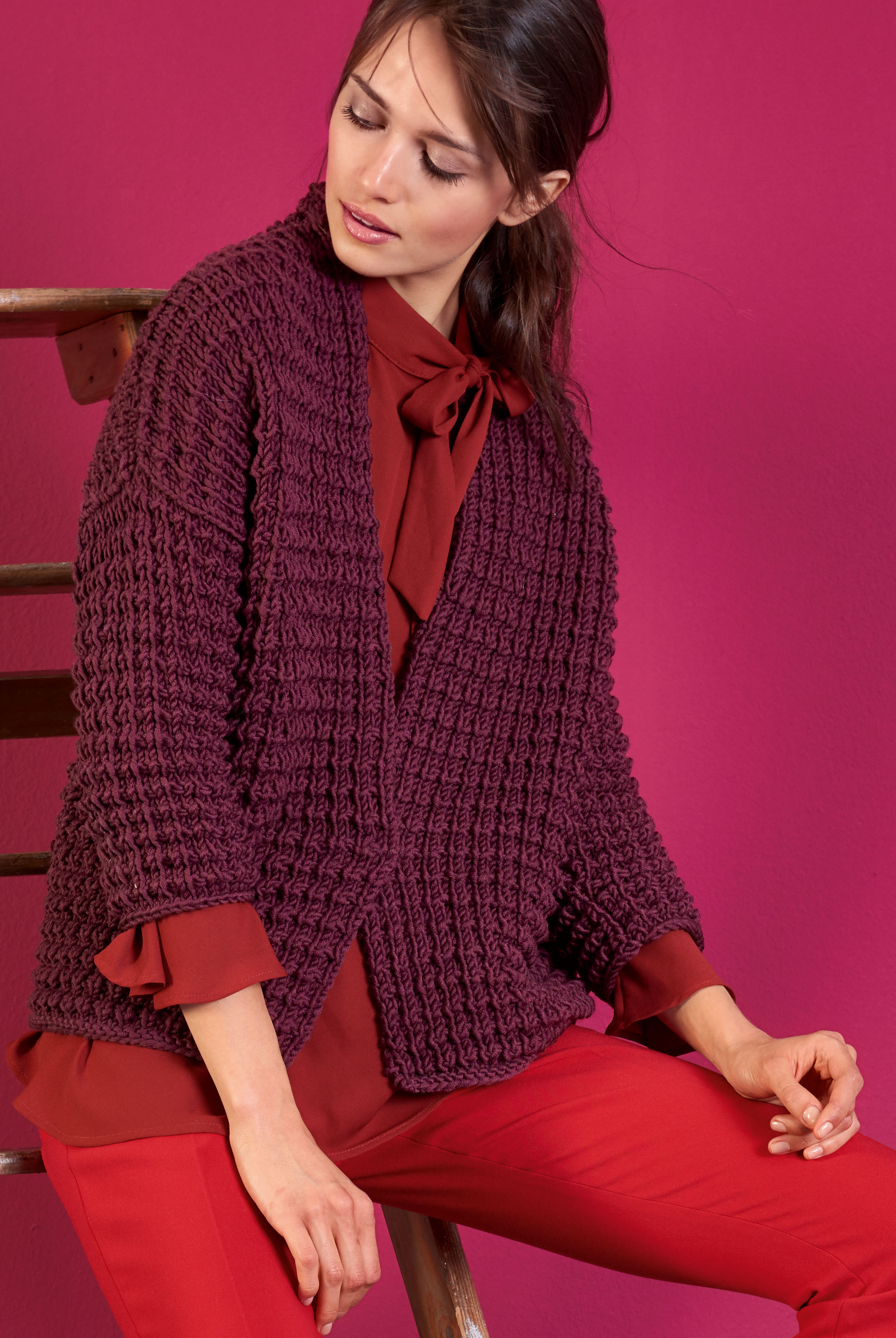 800 (850 – 900) г цвета бургунди (цвет 38) пряжи Superbingo фирмы Lana Grossa (100 % шерсти, 55 м/50 г); прямые спицы № 7 и 1 кнопка цвет темно-красный, размер 25 мм.