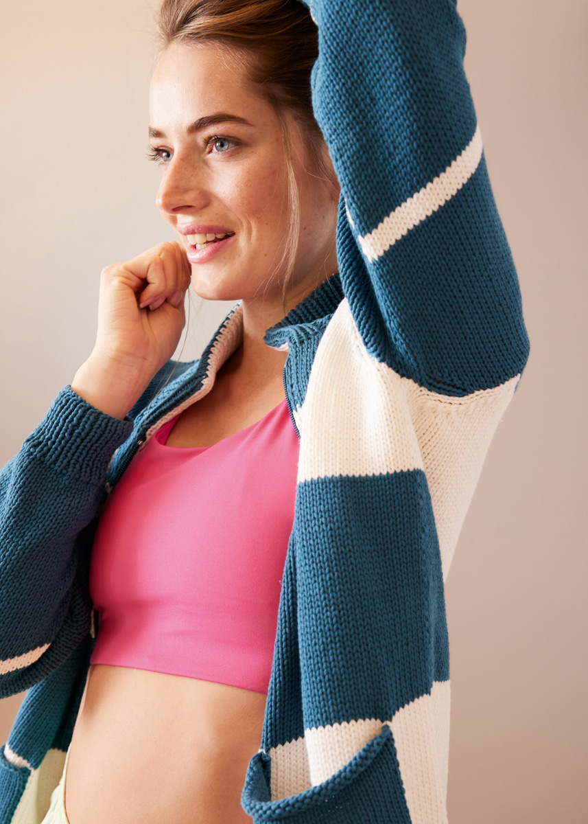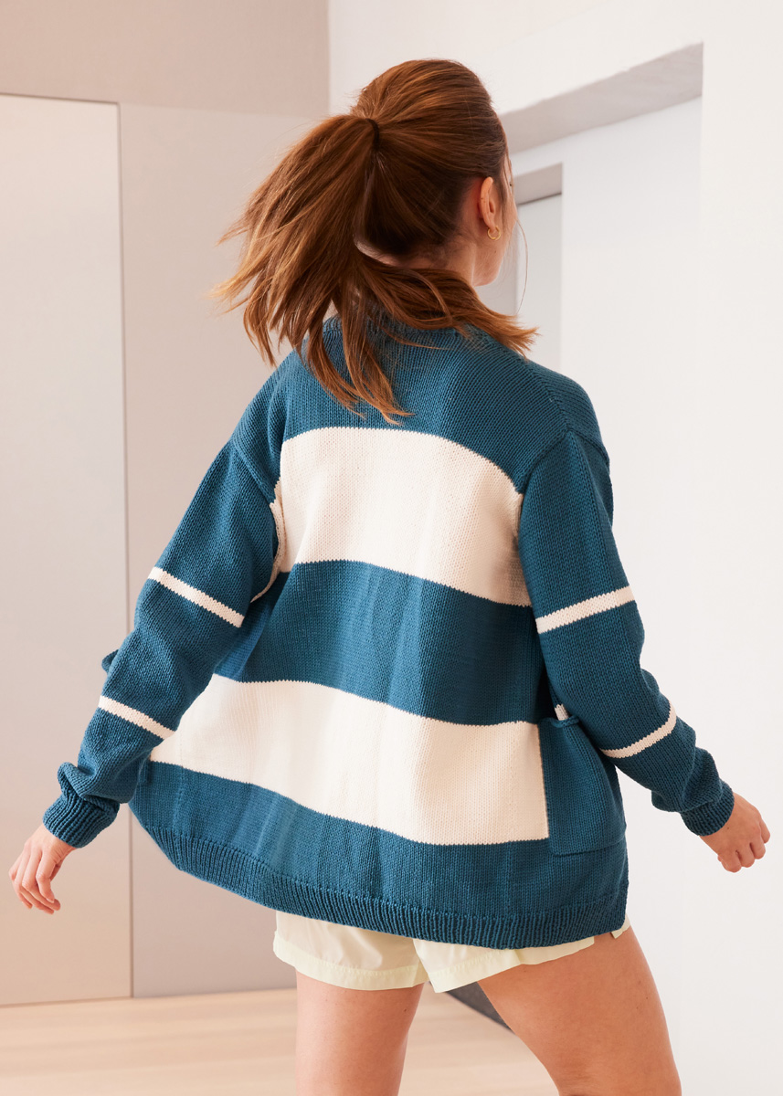 450 (500–550) г пе- трольной (цв. 7) и 250 (300–350) г белой (цв. 1) пряжи Riserva (70% (био) хлопка, 30% рециклированного полиамида, 125 м/ 50 г) фирмы Lana Grossa; прямые спицы № 6, круговые спицы № 6 длиной 60 см; 1 разъемная петрольная застежка-молния длиной 60 см.