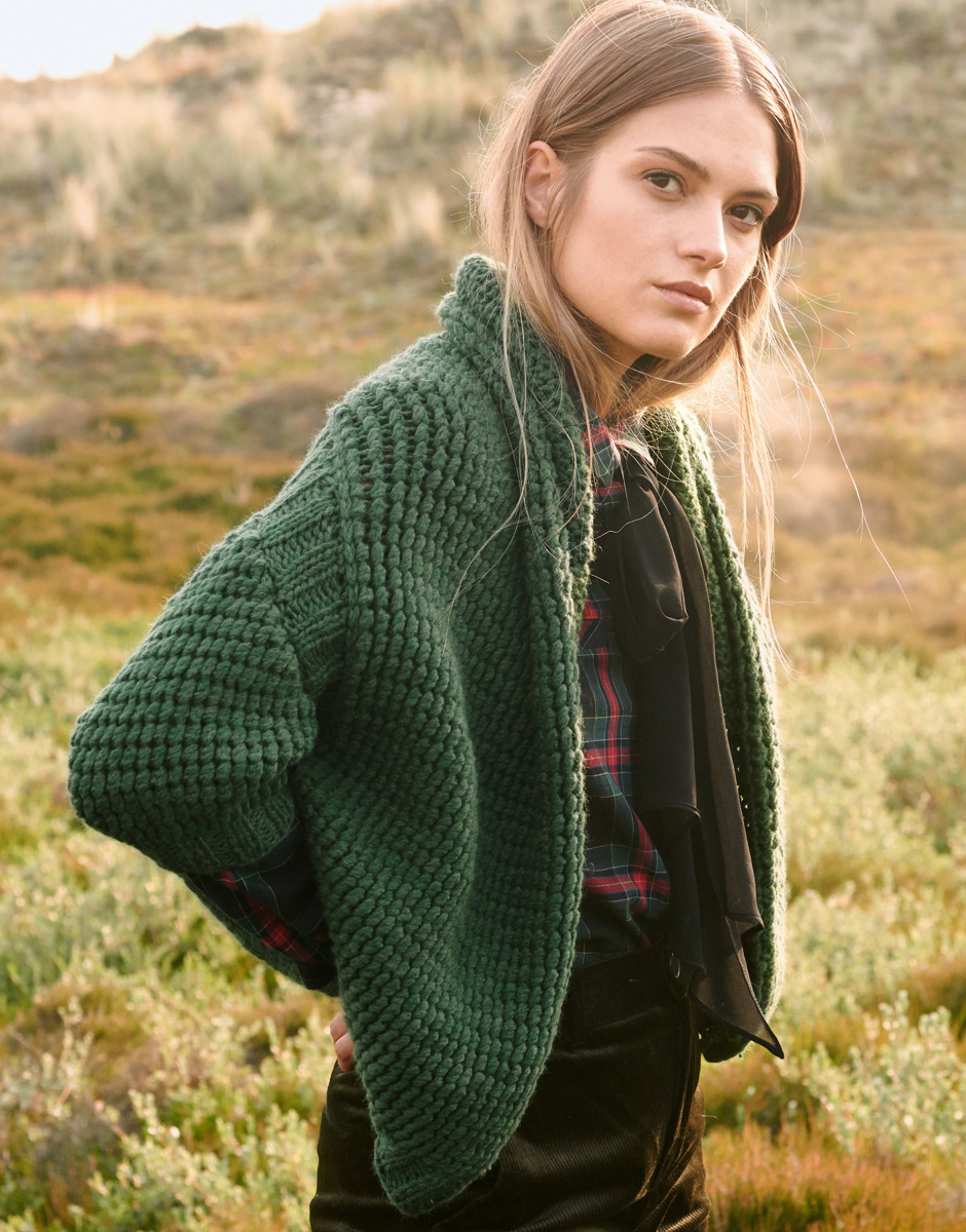 450 г мшисто-зеленой (цв. 35) пряжи Alta Moda Cashmere 16 (78% овечьей (мериносовой) шерсти, 12% кашемира, 10% полиамида, 110 м/50 г) фирмы Lana Grossa; прямые спицы № 7 и № 8, круговые спицы № 7 и № 8 длиной 80 см, круговые спицы № 8 длиной 120 см, крючок № 6