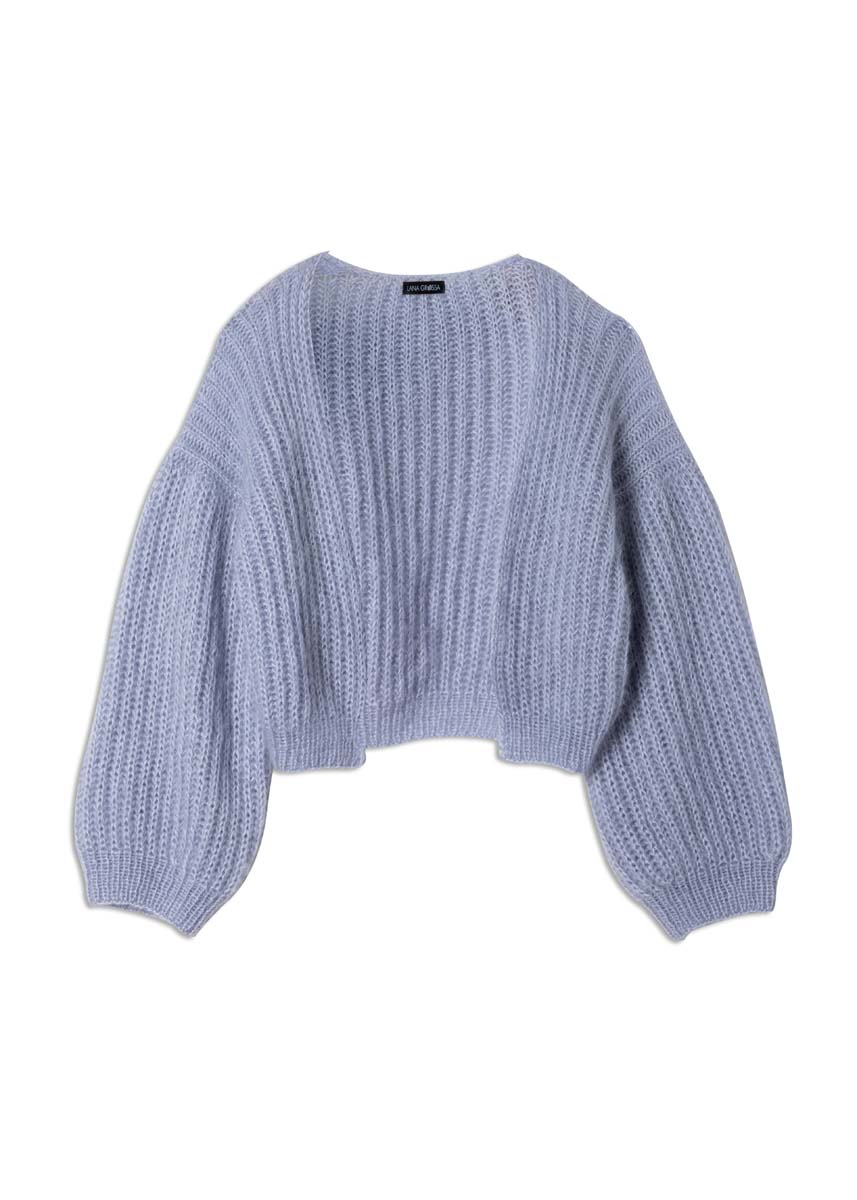 425 (450–475) г свет- ло-серой (цв. 189) пряжи Silkhair (70% мо- хера суперкид, 30% шелка, 210 м/25 г) фир- мы Lana Grossa и остаток контрастной пряжи для наборного края; прямые спицы № 6 и № 8, круговые спицы № 8 длиной 50 и 100 см, круговые спицы № 6 длиной 40 и 100 см