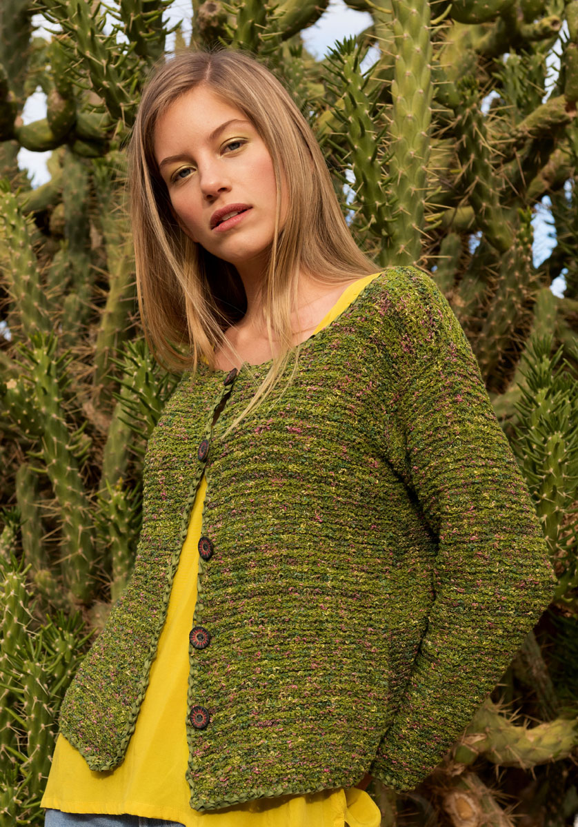 400 (450) 500 г оливковой/ярко-розовой/темно-зеленой (цв. 16) пряжи Coco (67% хлопка, 33% полиамида, 115 м/50 г) и 50 г оливково-зеленой (цв. 17) пряжи Alcanto (70% полиэстера, 30% полиамида, 125 м/50 г) фирмы Lana Grossa; прямые спицы № 5, крючок № 5; 5 черных/красных кокосовых пуговиц диаметром 23 мм