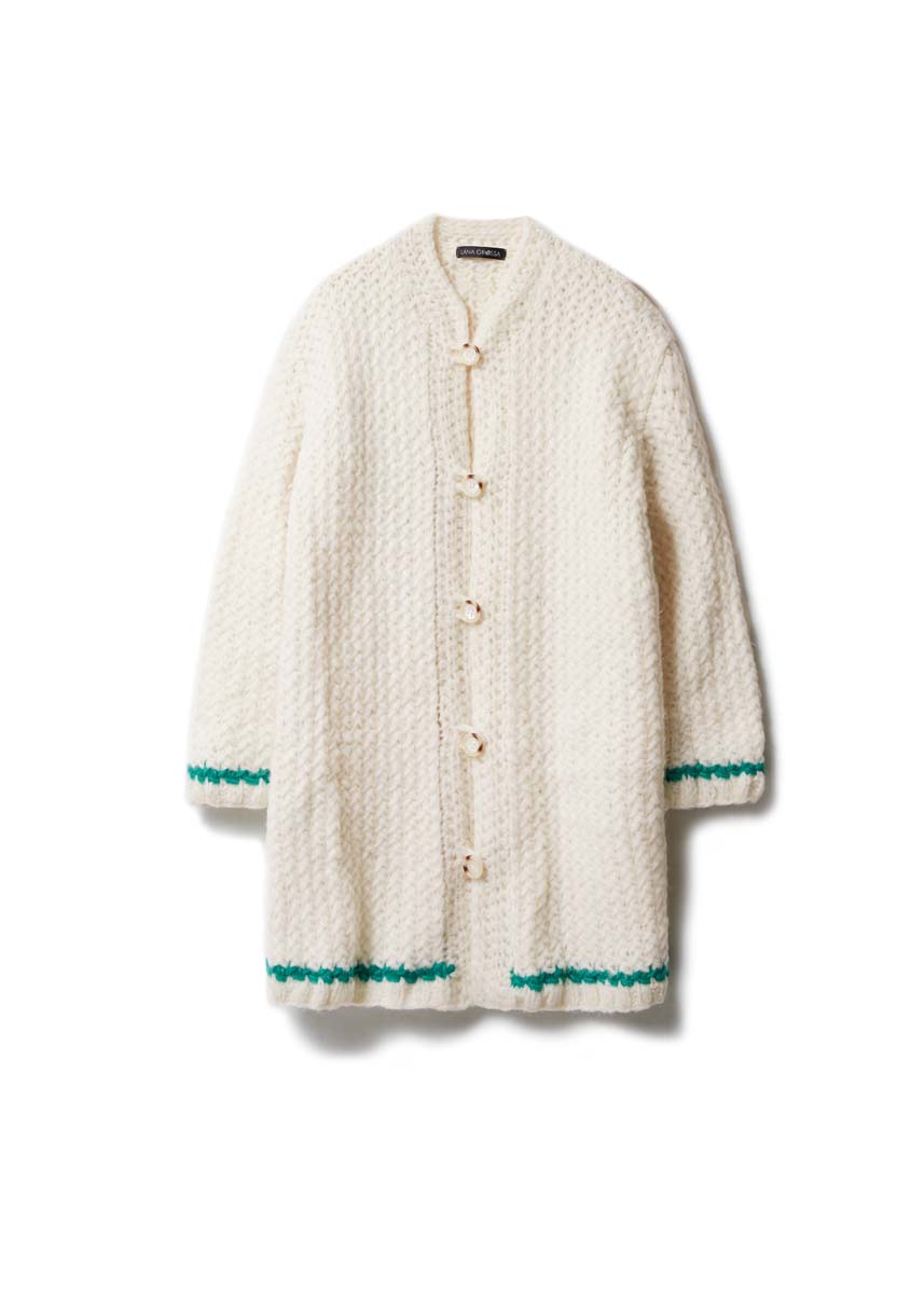 700 (750) г белой су- ровой (цв. 1) и 50 г бледно-зеленой (цв. 24) пряжи Alpaca Air (62% альпака бэби, 27% полиамида, 11% шерсти мерино экс- трафайн, 140 м/50 г) фирмы Lana Grossa; прямые спицы № 9, крючок № 8; 5 беже- вых пуговиц диаметром 28 мм.