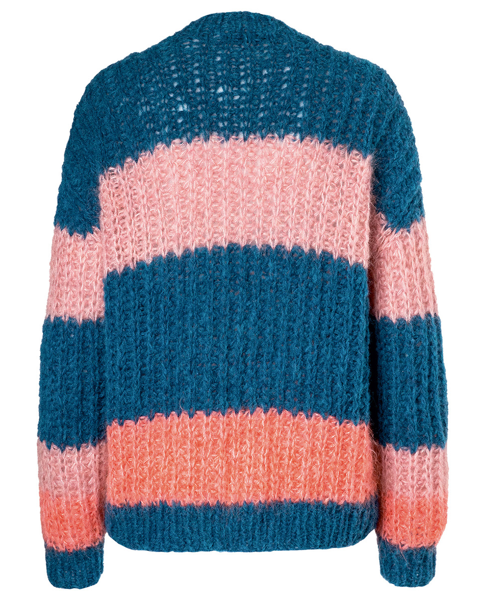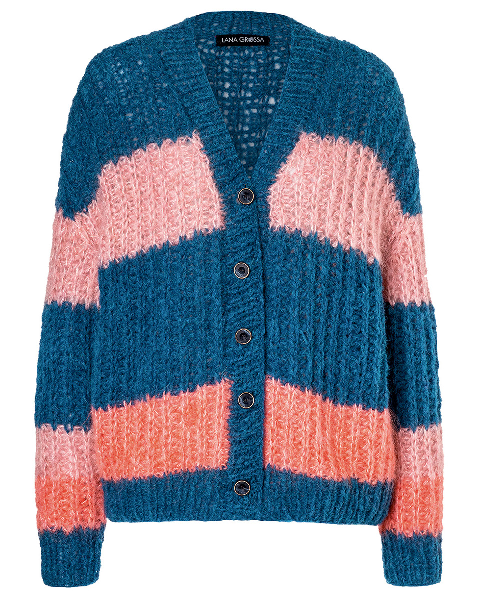 250 (300) г петроль- но-синей (цв. 8) пряжи Nuvoletta (42% шерсти (ягненка) альпака, 42% овечьей шерсти (мериносовой шерсти экстрафайн), 16% полиамида, 250 м/50 г) и по 100 (125) г желто-розовой (цв. 3) и цвета ро- зовой пудры (цв. 26) пряжи Brigitte No. 3 (40% мохера (суперкид), 37% шерсти, 23% полиамида, 100 м/25 г) фирмы Lana Grossa; прямые спицы № 7 и № 8, круговые спицы № 7 длиной 120 см; 5 подходящих по цвету роговых пуговиц диаметром 21 мм.