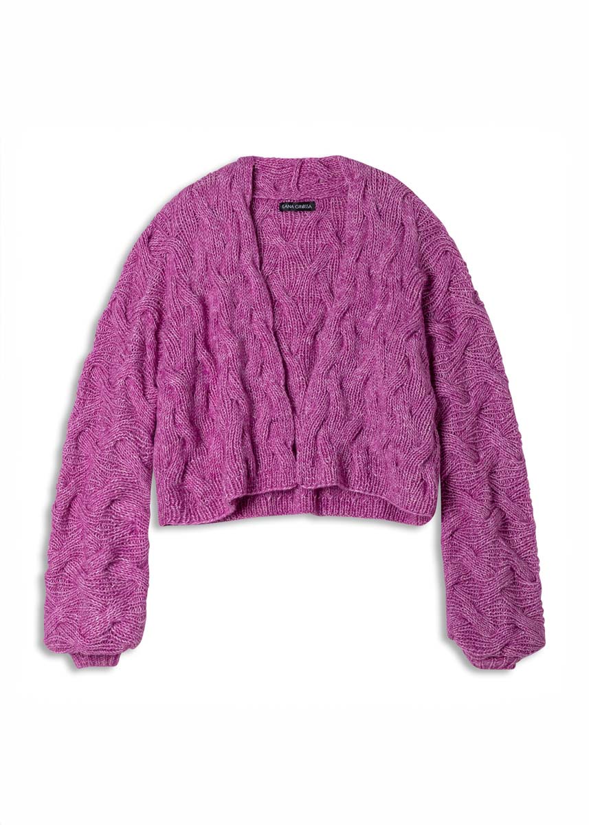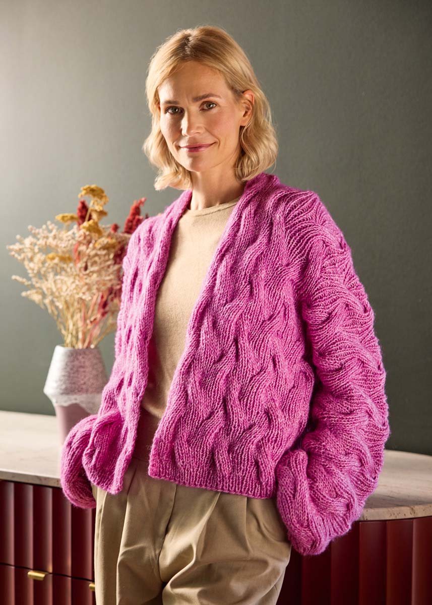 650 г цвета фуксии ме- ланжевой (цв. 29) пряжи Natural Alpaca Pelo (63% хлопка, 31% альпака бэби, 6% шерсти мерино, 125 м/50 г) фирмы Lana Grossa; прямые спицы № 5,5, круговые спицы № 5,5 длиной 120 см.