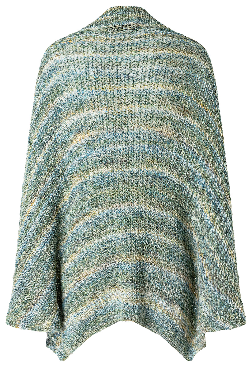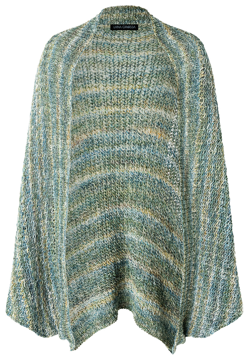 Lana Grossa-Qualität „About Berlin Vanity” (54 % хлопок, 21 % вискоза, 13 % шёлк, 12 % полиамид, длина нити = ca. 130 m/50 g): ок. 450 г петроль/карри/серо-зеленый/ натуральный многоцветный (цв. 9); кр. сп. 4 и 4,5, длиной 80 и 120 см