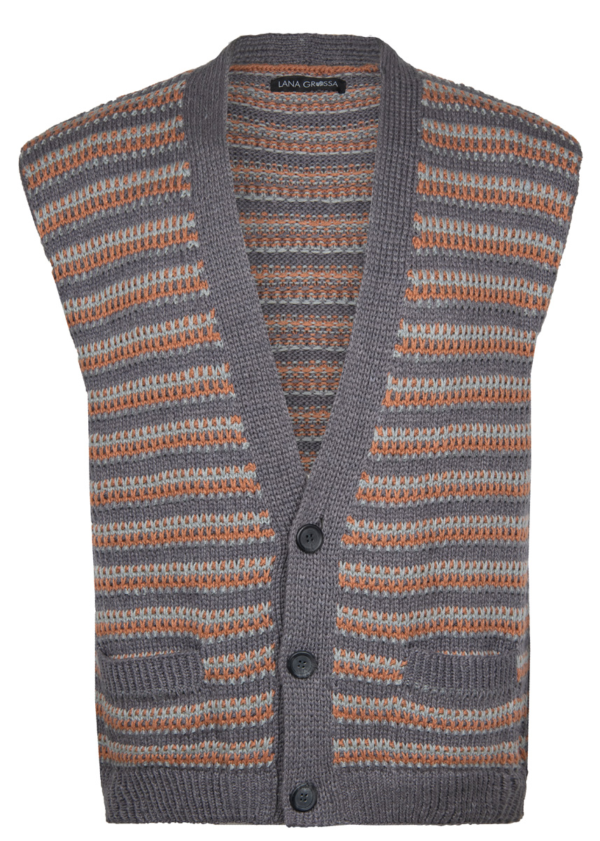 300 (350–400) г темно-серой (цв. 16), 100 (150–150) г зелено-серой (цв. 9) и 100 (150–150) г коричневый цвет корицы (цв. 3) пряжи Alta Moda Cotolana (45% мериносовой шерсти, 45% хлопка пима, 10% полиамида, 150 м/50 г) фирмы Lana Grossa; прямые спицы № 3 и № 4,5, круговые спицы № 3 длиной 40 см, 2 вспомогательные спицы, 3 серые пуговицы диаметром 24 мм