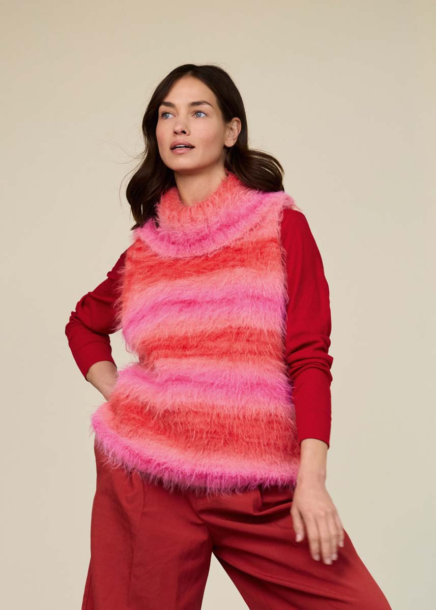 Lana Grossa-Qualität „Basta Mista“ (50% шерсть (меринос), 50% полиамид, длина нити = ca 100 m/50 g): 300 (400–400–500) г розовый/пинк/лососевый/коралловый/ красный (цв 106); сп. № 5 и 6; 1 кр. сп. № 5.