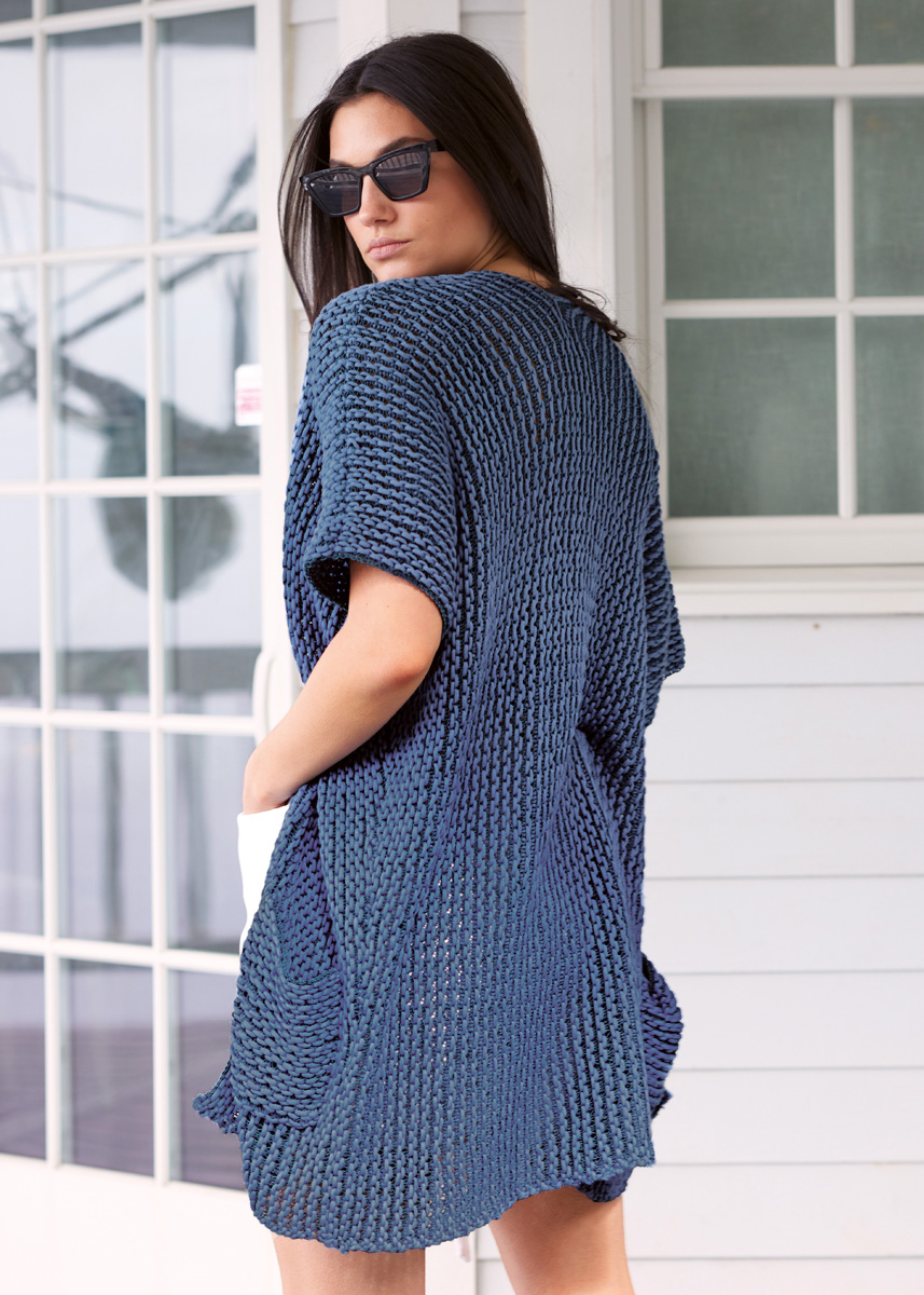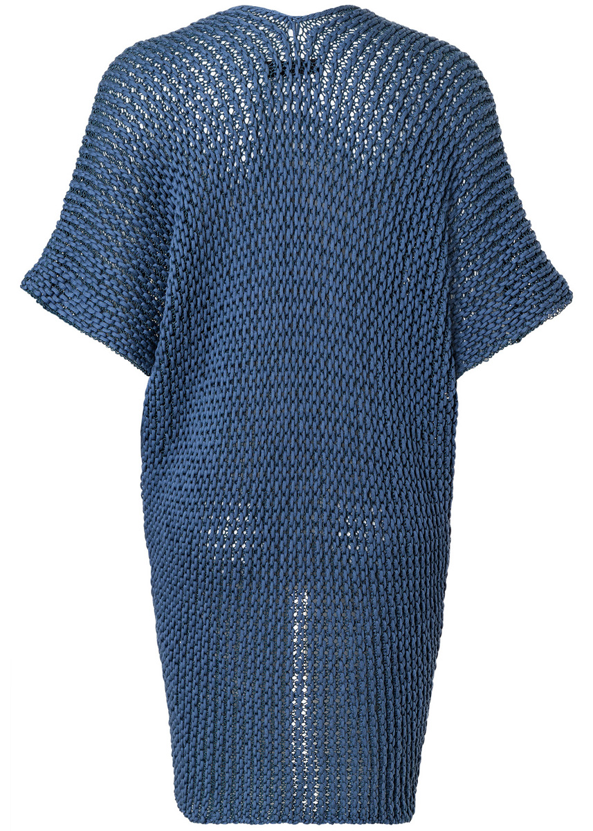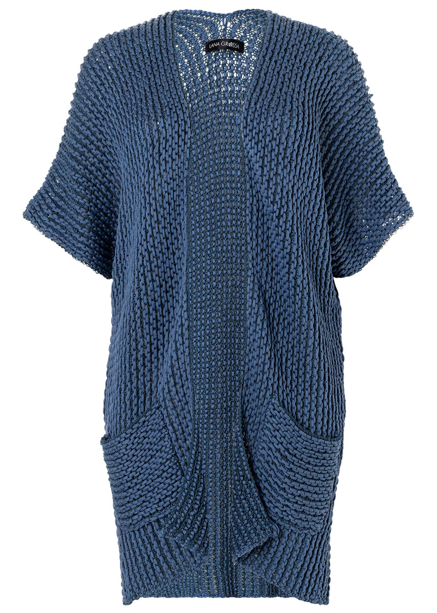 Lana Grossa Capri (55% хлопок, 30% полиамид, 15% щёлк, длина нити 150 m/50 g), 300 (350 – 400) г синий океан (цв 15) и Lana Grossa Cashseta (40% модаль, 30% полиамид, 15% кашемир, 15% шёлк, длина нити 100 m/50 g), 250 (300 – 350) г джинс-синий (цв 11); сп. № 6 и крючок № 4