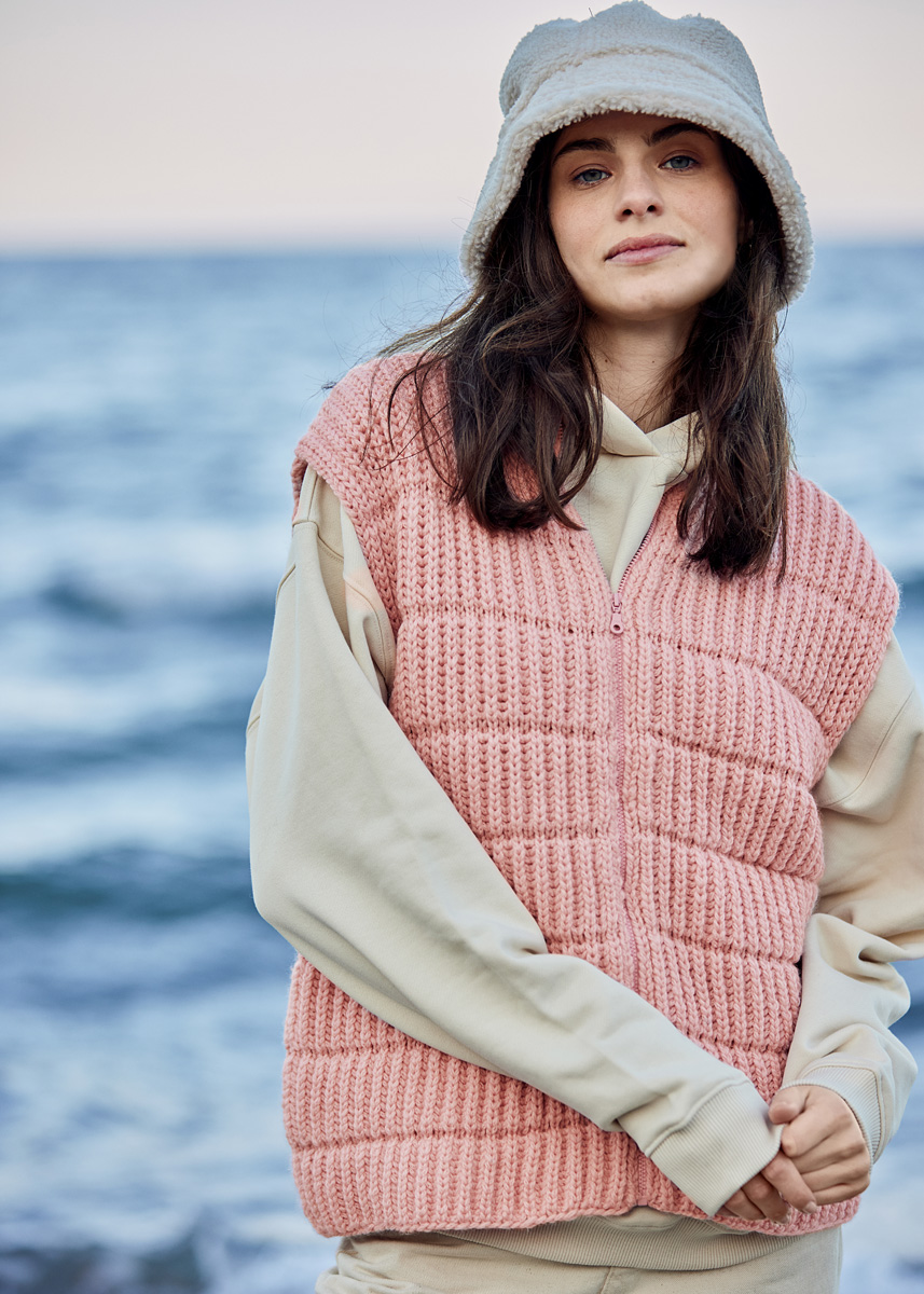 500 (550–600–650) г розовой (цв. 211) пряжи Cool Merino Big (90% шерсти мерино, 10% полиамида, 90 м/50 г) фирмы Lana Grossa; прямые спи- цы № 4 и № 5, короткие круговые спицы № 4; 1 разъем- ная розовая застежка-молния длиной 60 см