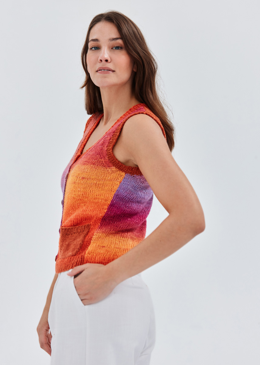 200 (200–300–300) г цвета красно- го вина/оранжевой/красной/огненно-красной/террако- товой/кирпично-красной/ярко-розовой/лиловой (цв. 4) пряжи Cotonella (100% хлопка пима, 280 м/100 г) фирмы Lana Grossa; прямые спицы № 3 и № 5, круго- вые спицы № 3; 5 перламутровых пуговиц диаметром 20 мм