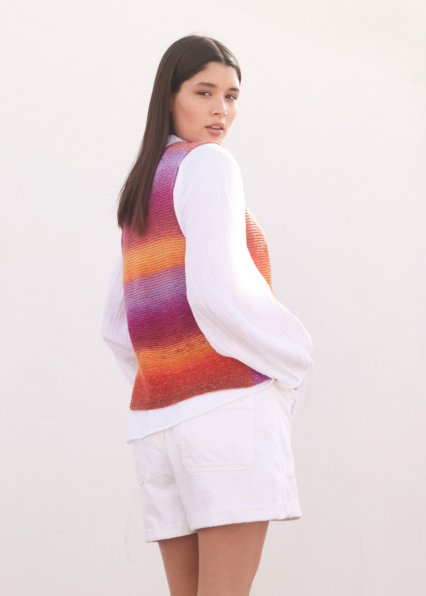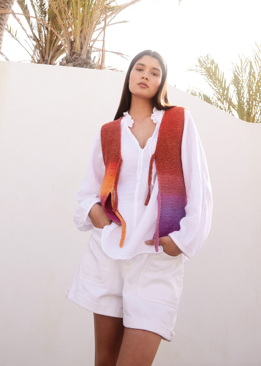 (3–4–4) мотка = 300 (300–400– 400) г цвета красного вина/оранжевой/красной/огненно- красной/терракотовой/кирпично-красной/ярко-розовой/ лиловой (цв. 4) пряжи Cotonella (100% хлопка пима, 280 м/100 г) фирмы Lana Grossa; прямые спицы № 4, крю- чок № 3,5.