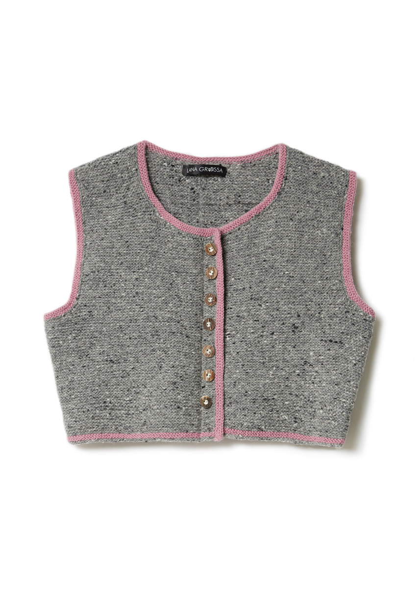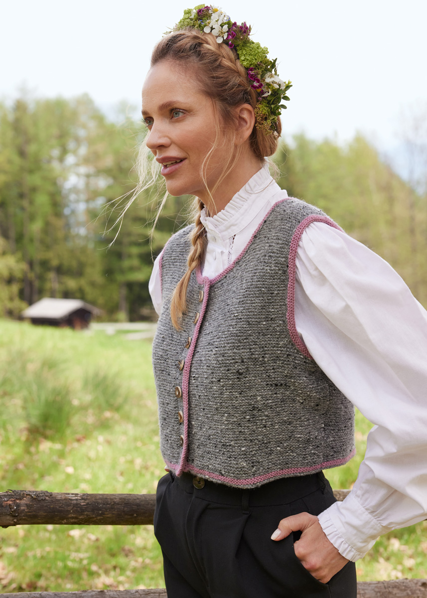 Lana Grossa Landlust Soft Tweed 180 (100% шерсть, длина нити 180 m/50 g), 200 (250 – 300) г серый меланжевый (цв 104) и Lana Grossa Alpina (80% шерсть, 20% полиамид, длина нити 210 m/100 g) 100 г ветхо-розовый (цв 67); сп. № 3 и 1 кр. сп. № 3, 80 см, 7 пуговицы от UNION KNOPF, Ø 15 мм.
