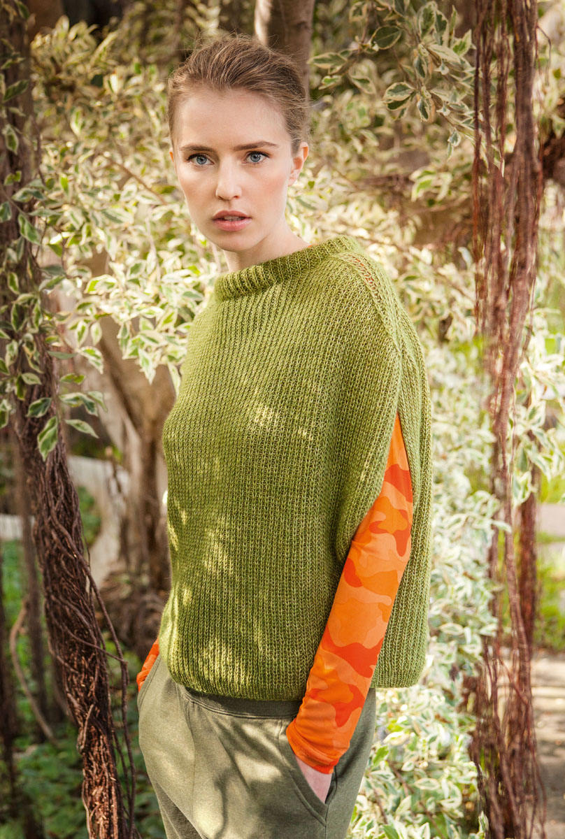 300 (350) 400 г светло-зеленой (цв. 2) пряжи Ecopuno (72% хлопка, 17% мериносовой шерсти, 11% шерсти ягненка альпака, 215 м/50 г) фирмы Lana Grossa; прямые спицы № 4, круговые спицы № 4 длиной 40 см