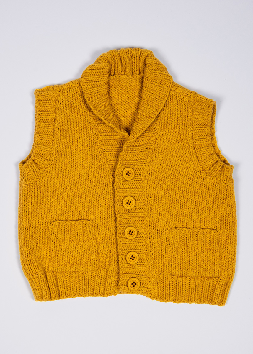 100 (100/150/150) г цвета желтого нарцисса (цв. 139) пряжи Elastico (96% хлопка, 4% полиэстера, 160 м/50 г) фирмы Lana Grossa; прямые спицы № 3 и № 3,5, круговые спицы № 3 длиной 40 см, пять пуговиц диаметром 15 мм