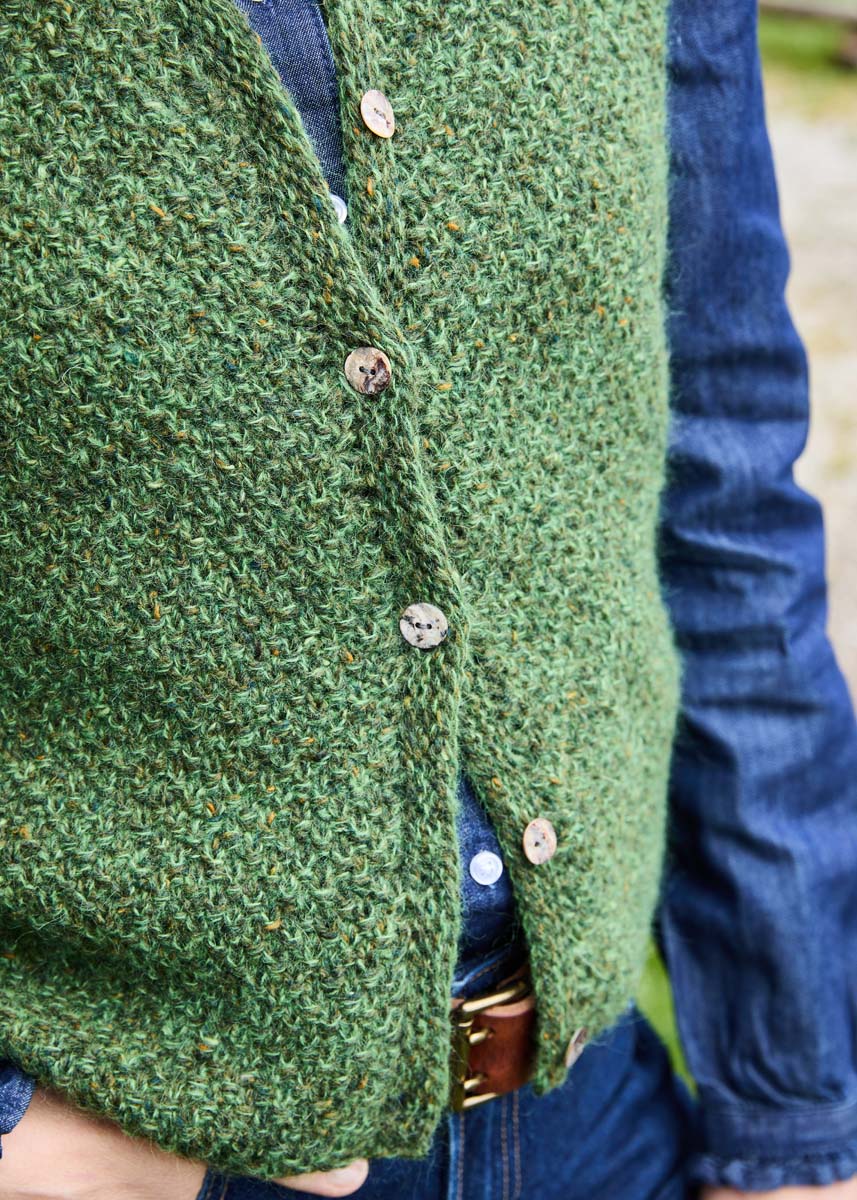 Lana Grossa-Qualität „Landlust Soft Tweed 180“ (100% шерсть, длина нити 180 m/50 g), 150 (200 - 200 - 250) г тёмно-зелёный меланжевый (цв 107), „Landlust-Kidmohair“ (70% мохера суперкид, 30% хлопок, длина нити 225 m/25 g), 75 (75 - 100 - 100) г зелёный (цв 4); сп. № 4,5 и 5, по 1 кр. сп. № 4,5, 40 см и 80 см, 5 пуговицы, 15 мм Ø.