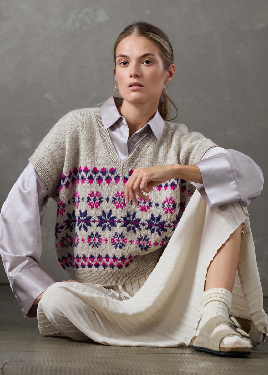 200 (250/250/300) г серо-бежевой (цв. 112) и по 50 г ярко-розовой (цв. 103) и цвета морской волны (цв. 106) пряжи Natural Lama Fine (100% шерсти лама бэби, 150 м/50 г) фирмы Lana Grossa; круговые спицы № 3 и № 3,5 длиной 80–100 см.