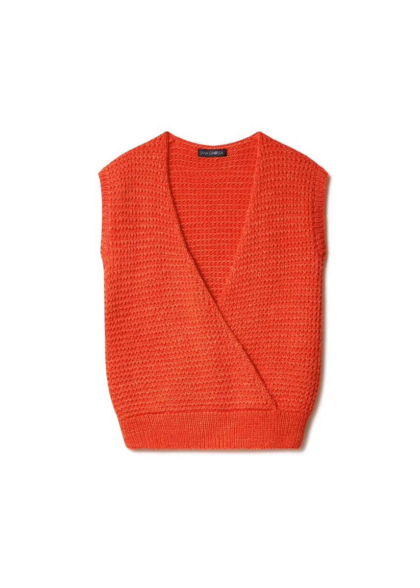 300 (350–400) г цвета красного мака (цв. 9) пряжи Setosa (65% шерсти мерино суперфайн, 35% шелка, 150 м/50 г) фирмы Lana Grossa; прямые спицы № 4 и № 4,5, круговые спицы № 4 длиной 60 см, крючок № 4