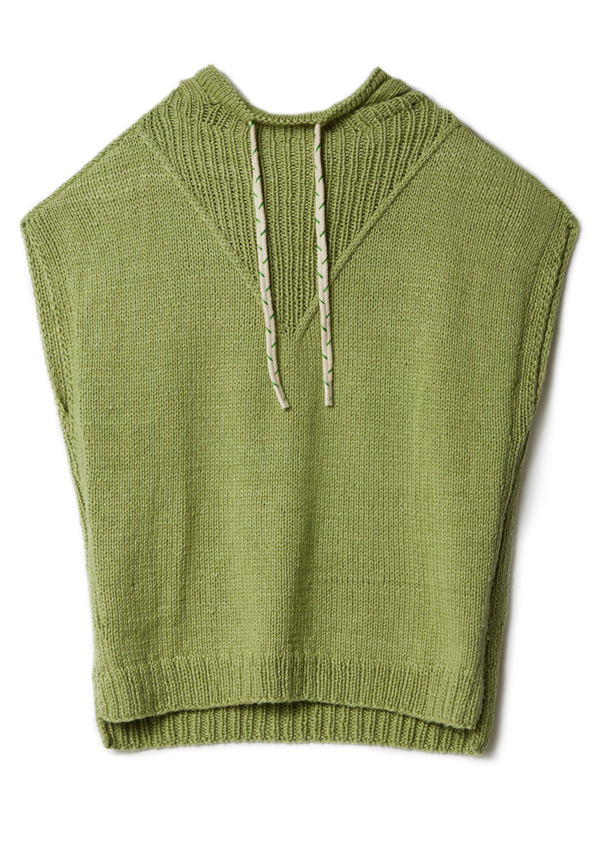 Lana Grossa „Puro Vegano“ (65% хлопок, 20% тенцель, 15% полиамид, длина нити 90 m / 50 g): для жилета 650 (700–750) г светло зелёный (цв. 15); 1 кр. сп. № 5, 80 см, 1 кр. сп. № 5, 40–60 см, 1 чул. сп. № 5, 1 вспом. сп., 2 маркировки, 2 лески, 110–120 см шнур, игла; ножницы.