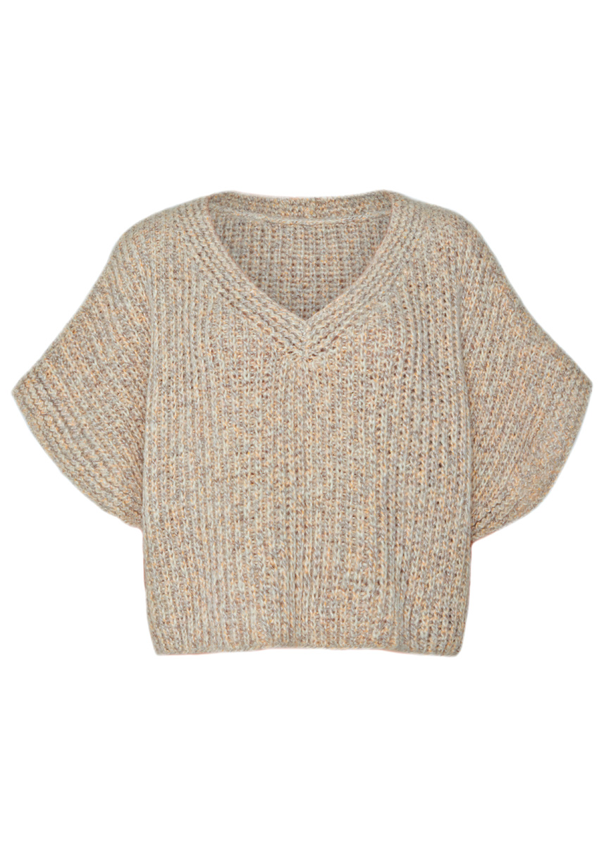 Lana Grossa-Qualität „Sara“ (65 % хлопок, 30 % беби альпака, 5 % шерсть (меринос), длина нити 125 m/50 g): ок. 350 г бежевый/ золотисто-жёлтый меланжевый (цв. 19); сп. № 5,5, 1 кр. сп. № 5,5, 80 см длиной