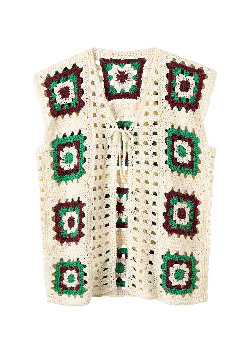 Lana Grossa-Qualität „Soft Cotton” (70 % хлопок, 30 % полиакрил, длина нити = ca. 140 m/50 g): ок. 350 г экрю (цв. 2) и по ок. 100 г бургунд (цв. 44) и нефритово-зеленый (цв. 51); 1 крючок № 4,5.