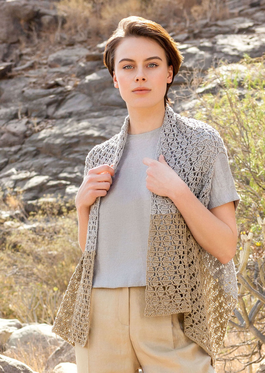 Lana Grossa Solo Lino (80 % переработанный лён (вискоза), 20 % лён, длина нити: около 120 м / 50 г) 250 (300 – 350) г светло-серый (цв. 5) и 200 (250 – 300) г тростник (цв. 8); крючок № 4