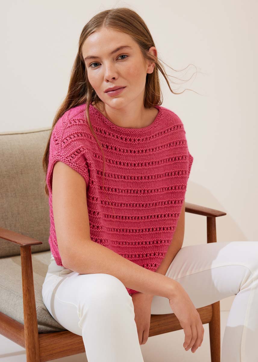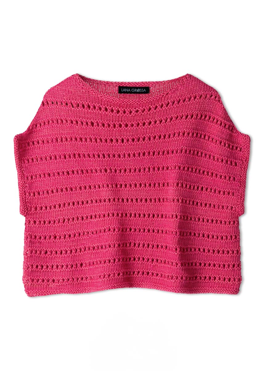 Lana Grossa-Qualität „Summer Softness“ (80 % хлопок (био), 20 % шерсть (меринос суперфейн), длина нити = ca 130 m/50 g): ок 250 (300–300–350) г пинк (цв 8); кр. сп. № 4,5; маркировка.