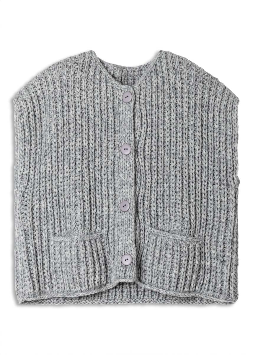 400 (450–500) г светло-серой (цв. 5) пряжи Lala Berlin Lovely Cotton (75% шерсти мерино суперфайн, 25% хлопка, 90 м/50 г) фирмы Lana Grossa; прямые спицы № 6, крючок № 5; 4 серые пуговицы диаметром 25 мм