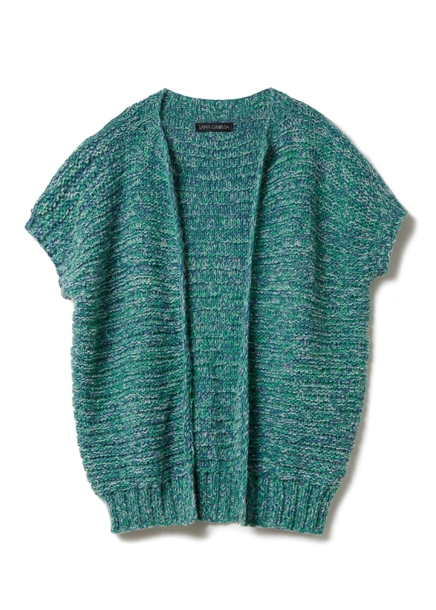 75 (100–100) г бе- лой суровой (цв. 1) пряжи Bella (35% хлопка, 30% нейлона, 25% альпака бэби, 10% шерсти мерино, 250 м/25 г), 200 (250–250) г цвета морской волны (цв. 7) пряжи Landlust Sommerseide (50% шел- ка, 50% хлопка, 170 м/50 г) и 150 (200– 200) г бледно-зеленой (цв. 11) пряжи Sottile (85% хлопка, 15% шерсти мерино, 250 м/50 г) фирмы Lana Grossa; круговые спицы № 6 и № 8 длиной 100 см, кру- говые спицы № 6 длиной 50 см, крючок № 7, 2 маркера для петель