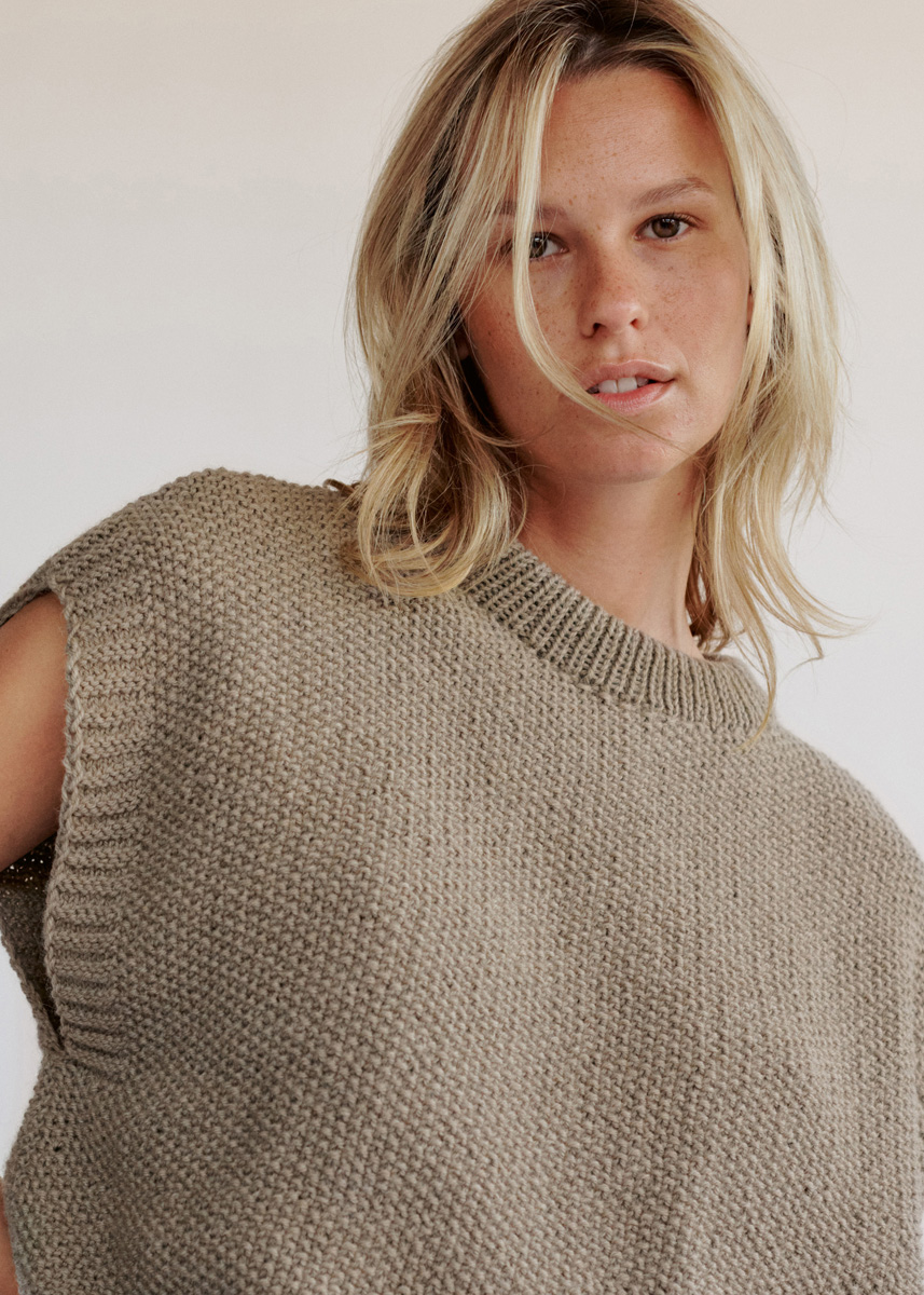 450 (500–550) г розо- вато-коричневой (цв. 304) пряжи Landlust Alpaka Merino 100 (50% альпака бэби, 50% шерсти мерино, 100 м/50 г) фирмы Lana Grossa; прямые спицы № 4,5 и № 5, круго- вые спицы № 4,5 длиной 50 см