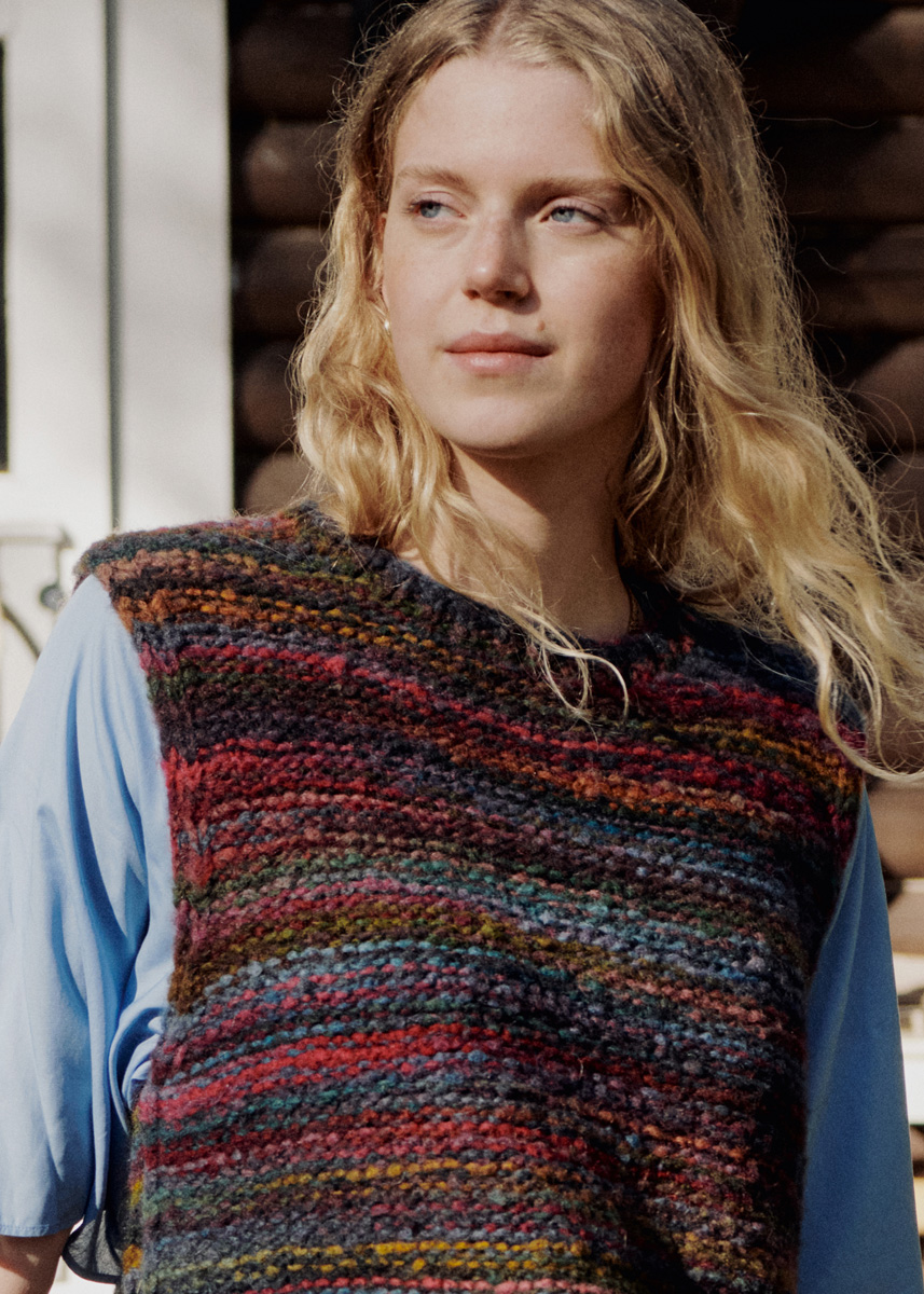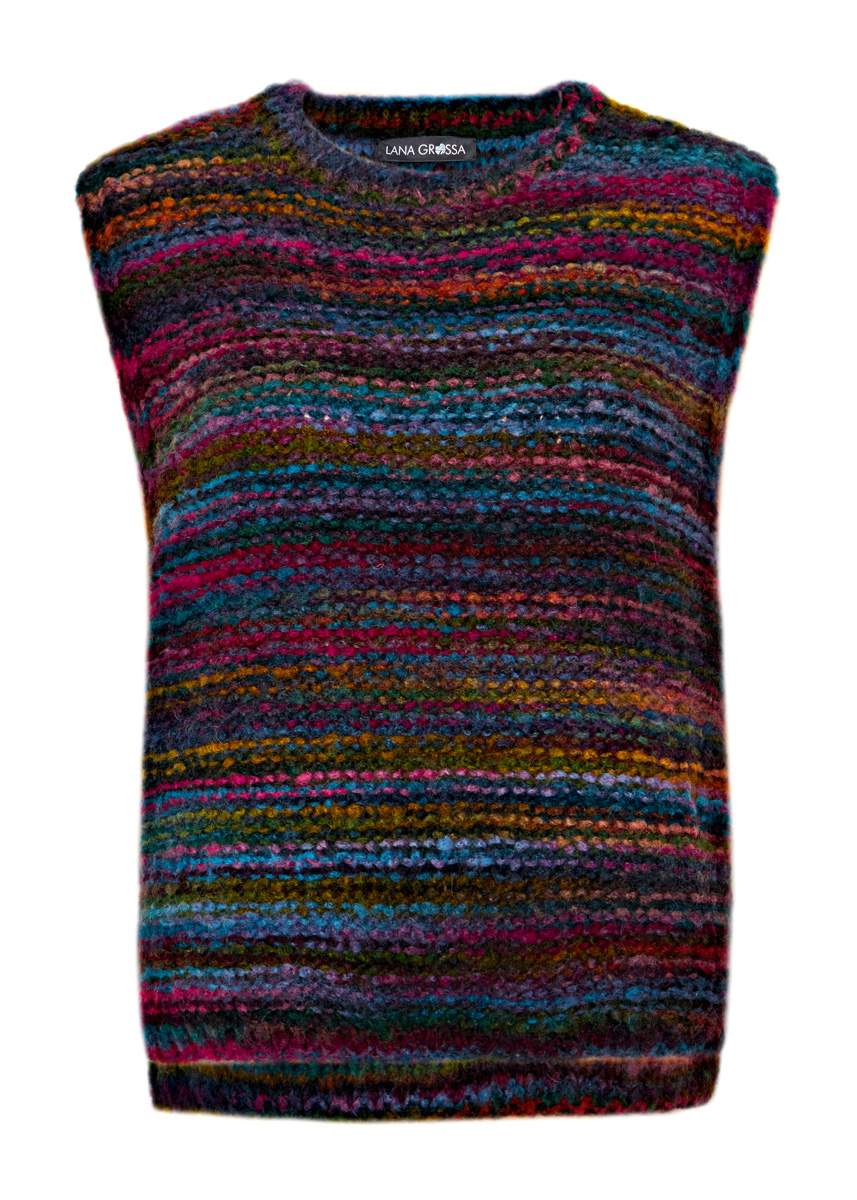 Lana Grossa-Qualität „Twin 50 g“ (46 % беби альпака, 45 % шерсть (меринос), 9 % полиамид, длина нити 85 m/50 g): ок. 200 (250–300) г серо-синий/пинк/оливковый/ тёмно-зелёный/пурпурный/охра/серо-зеленый/петроль (цв. 201); сп. № 7, 1 кр. сп. № 7, 40 см длиной