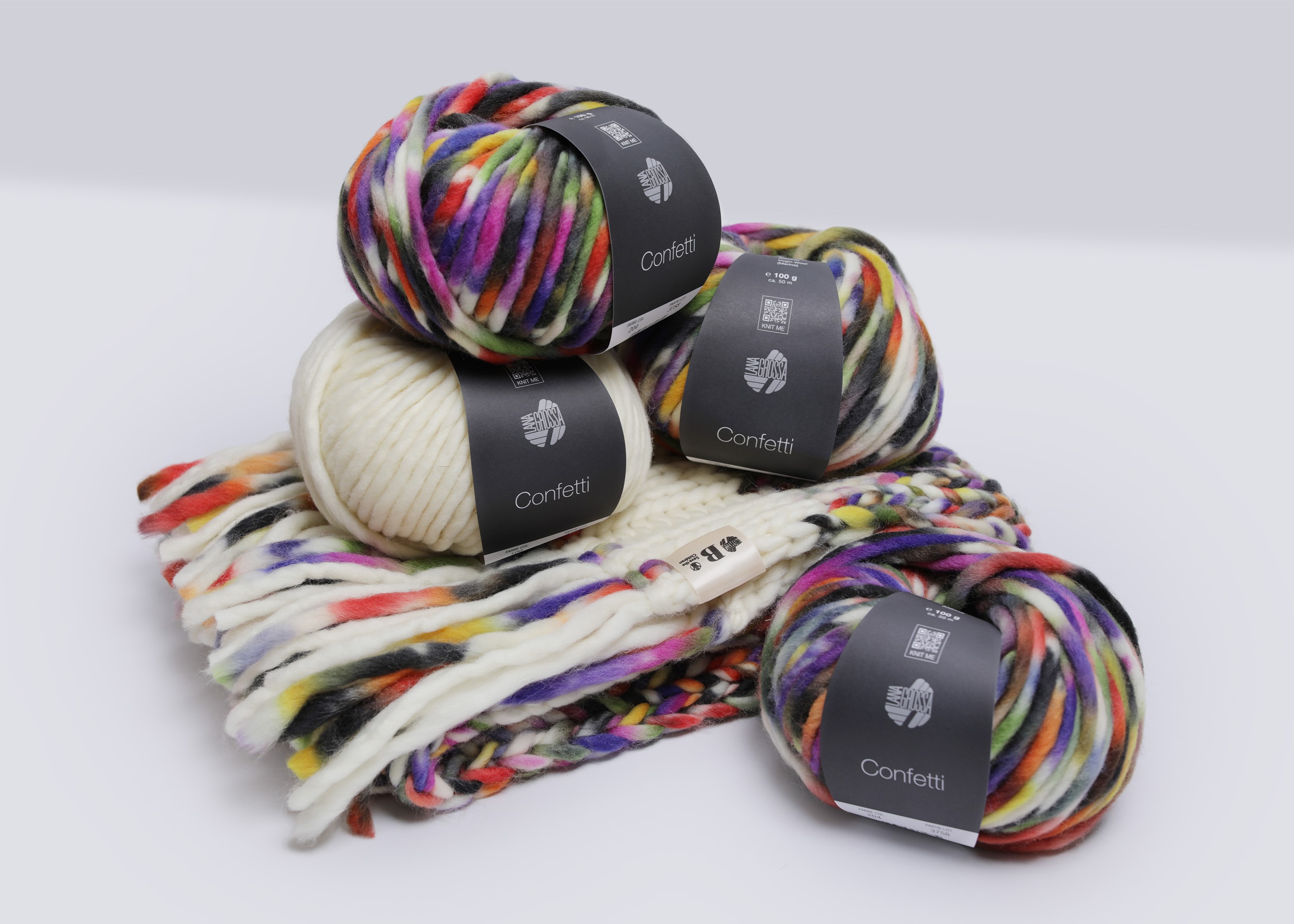 Lana Grossa, Qualität “Confetti“ (100% шерсть(меринос), длина нити 50m/100g): 300 г в цв. 204 (белый, оранжевый, желтый, красный, серый, светло зеленый, темно зеленый, лиловый, сине фиолетовый), 100 г в цв.. 109 (чисто белый)